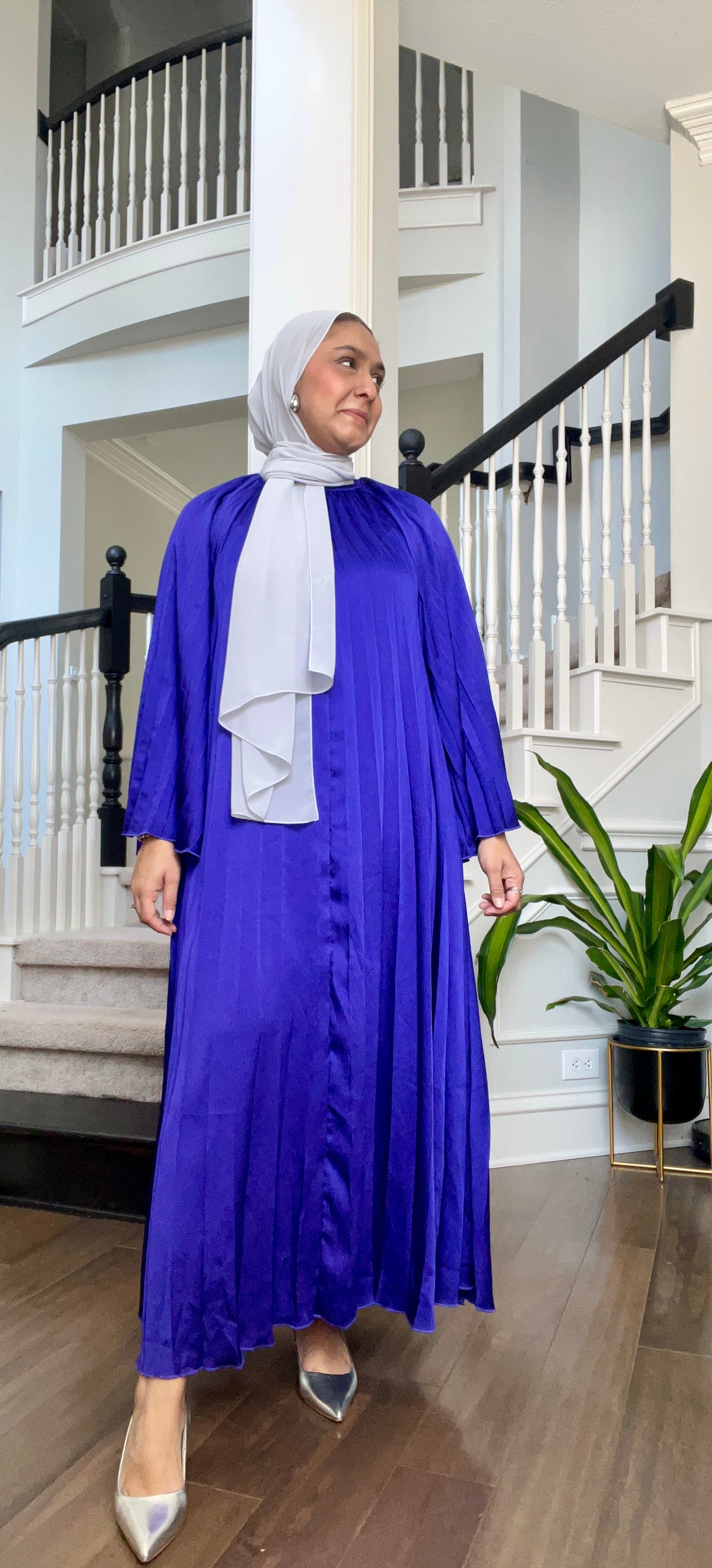Discover the epitome of graceful modesty with our Royal Pleated Maxi Dress. Crafted from luxurious silk-satin fabric, this stunning piece drapes beautifully, offering a magnificent sheen that catches the light with every movement. The dress features intricate, continuous pleating from the bodice down to the flowing hem, creating a mesmerizing silhouette that exudes sophistication. Its relaxed, open fit and elegantly wide, pleated sleeves ensure both comfort and a distinctly chic aesthetic. Perfect for special occasions, evening events, or simply elevating your everyday modest fashion. Pair it with nude heels and a complementary hijab for an effortlessly polished look.