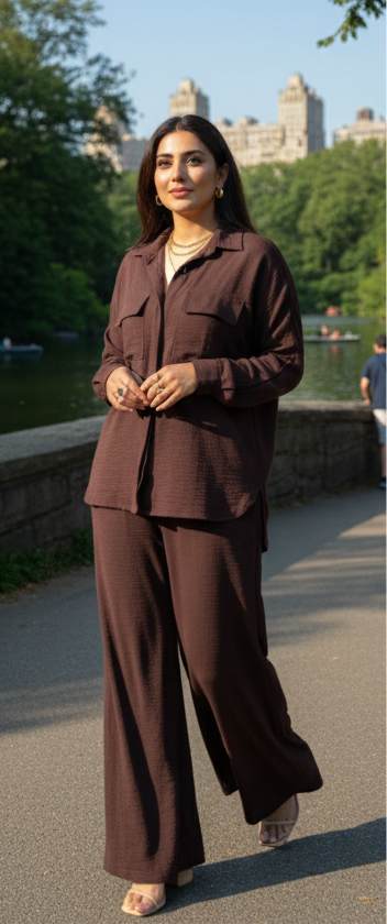 Elevate your everyday style with our Chocolate Brown Co-ord Set, designed for both comfort and elegance. This two-piece set features a flowy, button-down shirt with front pockets paired with wide-leg pants that drape effortlessly for a flattering silhouette. Made from breathable fabric, it’s perfect for all-day wear—whether you’re dressing it up with heels and accessories or keeping it casual with flats. A timeless modest look that transitions seamlessly from day to night.