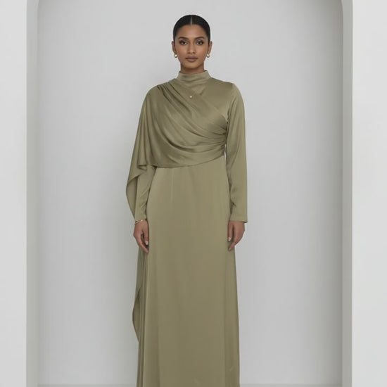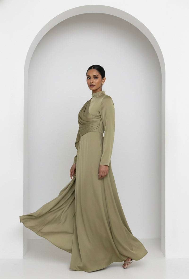 Elevated modesty with effortless movement. Our Side-Swept Drape Dress features a beautifully sculpted drape across the bodice that flatters the waist and flows into a full, graceful skirt. Designed with a high neckline and long sleeves, this piece blends timeless elegance with a modern silhouette.